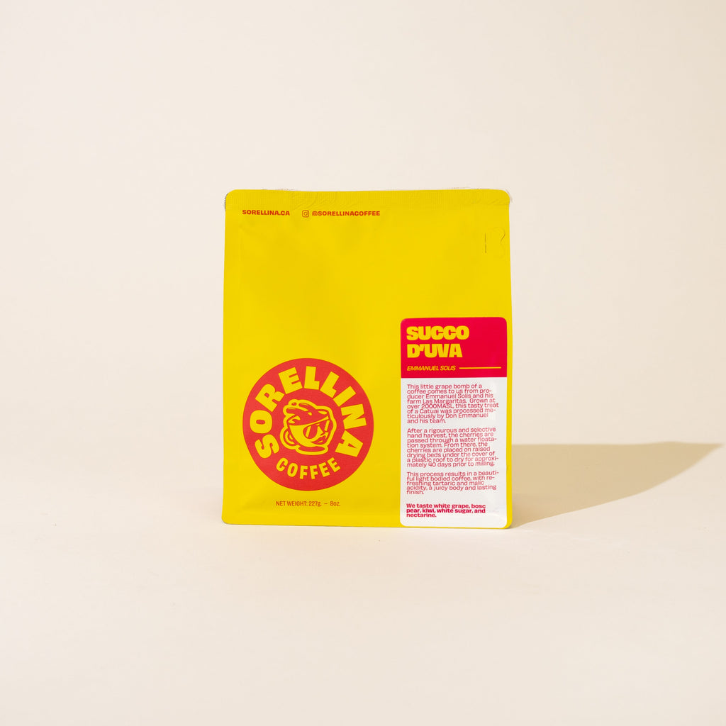 "This little grape bomb of a coffee comes to us from producer Emmanuel Solis and his farm Las Margaritas. Grown at over 2000 meters above sea level, this tasty treat of a Catuai was processed meticulously by Don Emmanuel and his team. After a rigorous and selective hand harvest, the cherries are passed through a water floatation system. From there, the cherries are placed on raised drying beds under the cover of a plastic roof to dry for approximately 40 days prior to milling. This process results in a beautiful light-bodied coffee, with refreshing tartaric and malic acidity, a juicy body and lasting finish."